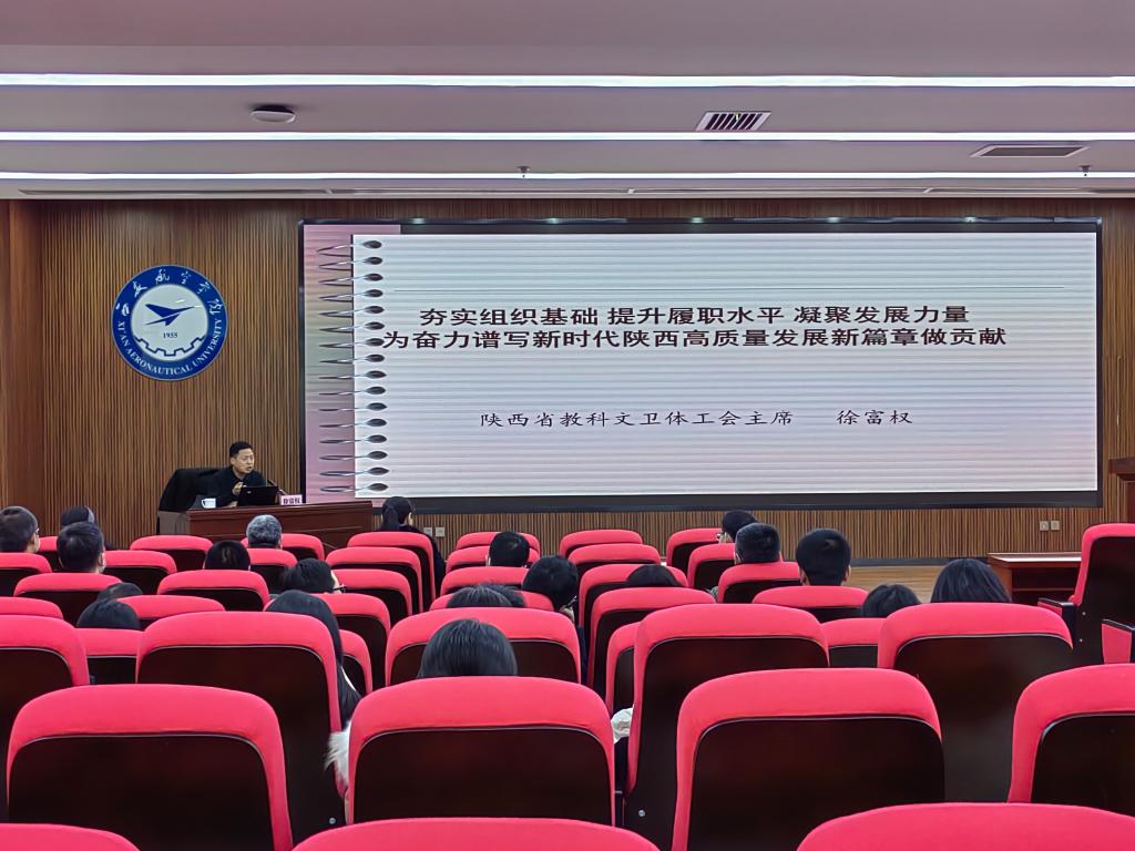 12月12日下午,学校工会在莲湖校区图书馆五楼报告厅召开工会干部培训会,陕西省教科文卫体工会主席徐富权应邀出席并作专题报告。