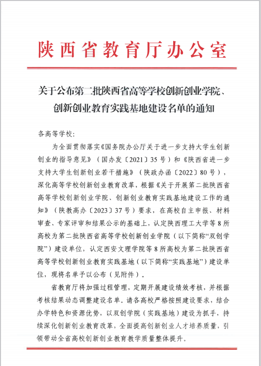 近日,陕西省教育厅《关于公布第二批陕西省高等学校创新创业学院、创新创业教育实践基地建设名单的通知》,贝博官网成功入选第二批陕西省高等学校创新创业教育实践基地建设单位。此次入选,是学校深化高等学校创新创业教育改革、加强创新创业人才培养取得的一次标志性成果。
