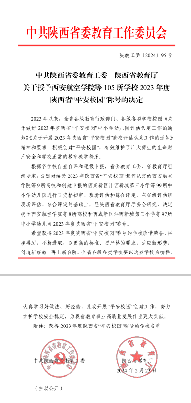 近日,中共陕西省委教育工委、陕西省教育厅印发了《关于授予BB贝博艾弗森官方网站等105 所学校2023年度陕西省“平安校园”称号的决定》(陕教工函〔2024〕95 号),贝博官网被授予省级“平安校园”称号。这是贝博官网自2008年首批首次获省级“平安校园”后,第四次荣获佳绩。