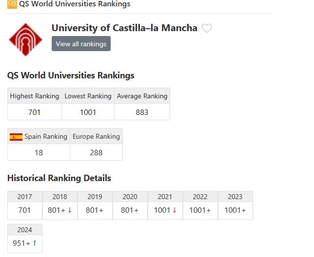 卡斯蒂利亚拉曼查大学托莱多工业与航空航天工程学院,有三个本科专业学位:电机工程、工业电子与自动化工程和航空航天工程。该学院自1983年成立以来,在工业工程不同分支的工程师培训方面拥有丰富的经验。(QS排名:800-1000左右)(文/王坚 审核/王坚)