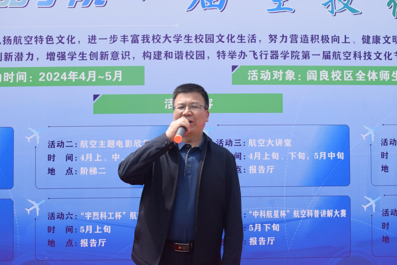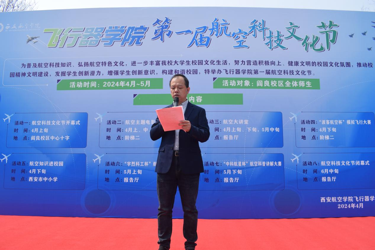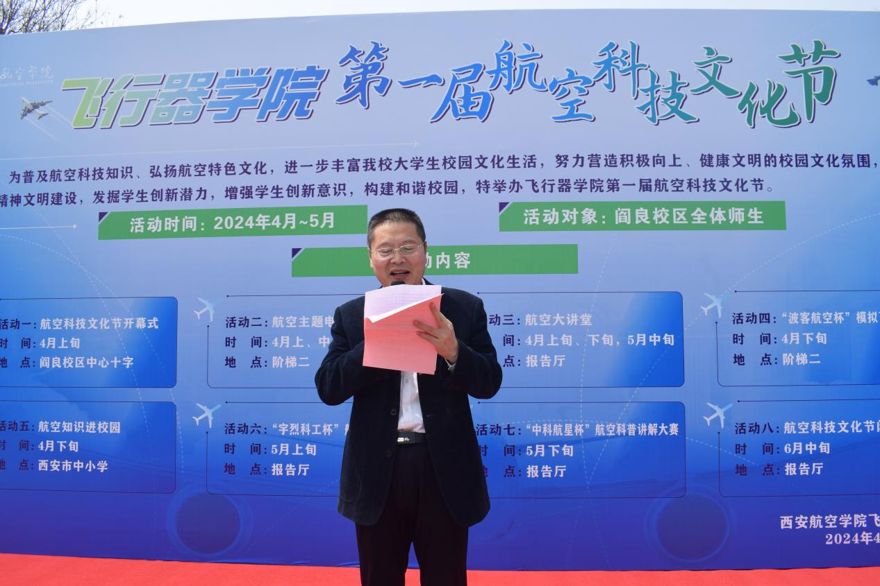董彦非致开幕词,他代表飞行器学院全体师生,向莅临开幕式的嘉宾表示热烈的欢迎和衷心的感谢,并指出本届航空科技文化节以“创新、实践、交流、发展”为主题,旨在通过一系列丰富多彩的活动,让同学们深入体验航空科技、感悟航空文化,锻炼动手能力和团队协作能力,培养创新精神和探索精神。