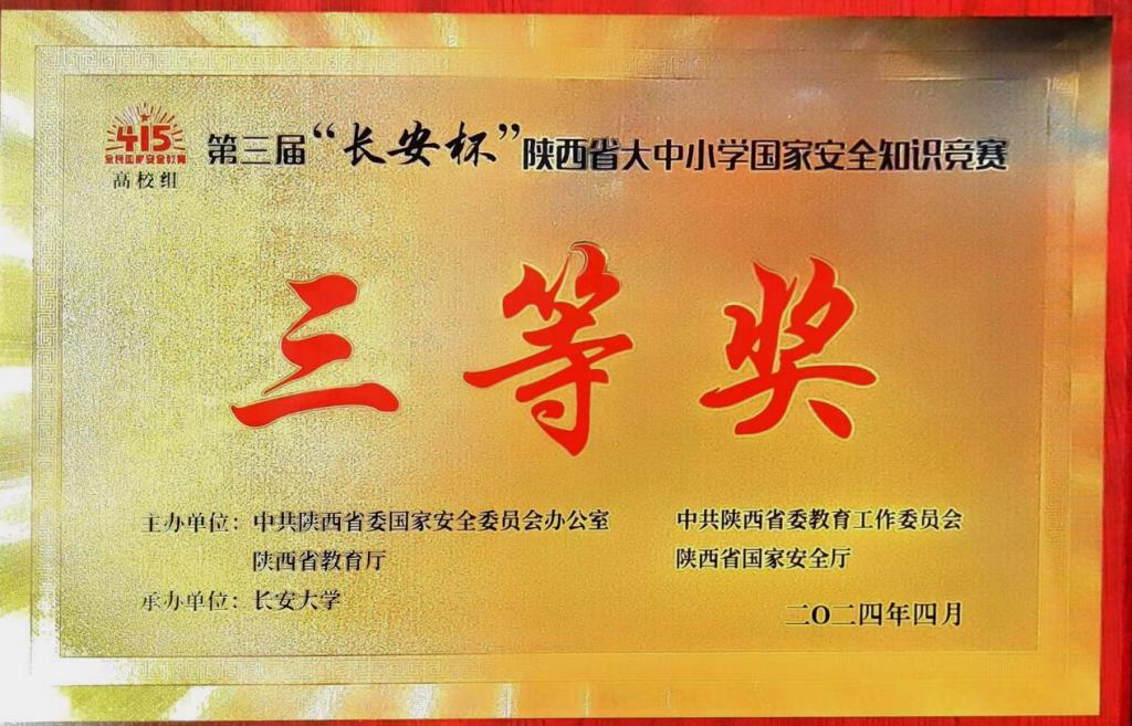 4月13日,由陕西省委国家安全委员会办公室、省委教育工委、省教育厅和省国家安全厅共同主办,长安大学承办的第三届“长安杯”陕西省大中小学国家安全知识竞赛(高校组)决赛圆满落幕,共9支高校代表队参加,分为“有问必答”、“一站到底”、安全公开课、终级PK四个环节,贝博官网由能源与建筑学院薛域原、奕欣,电子工程学院李婧雅、机械工程学院路传浩4位同学组成代表队,经过激烈角逐,最终荣获三等奖。