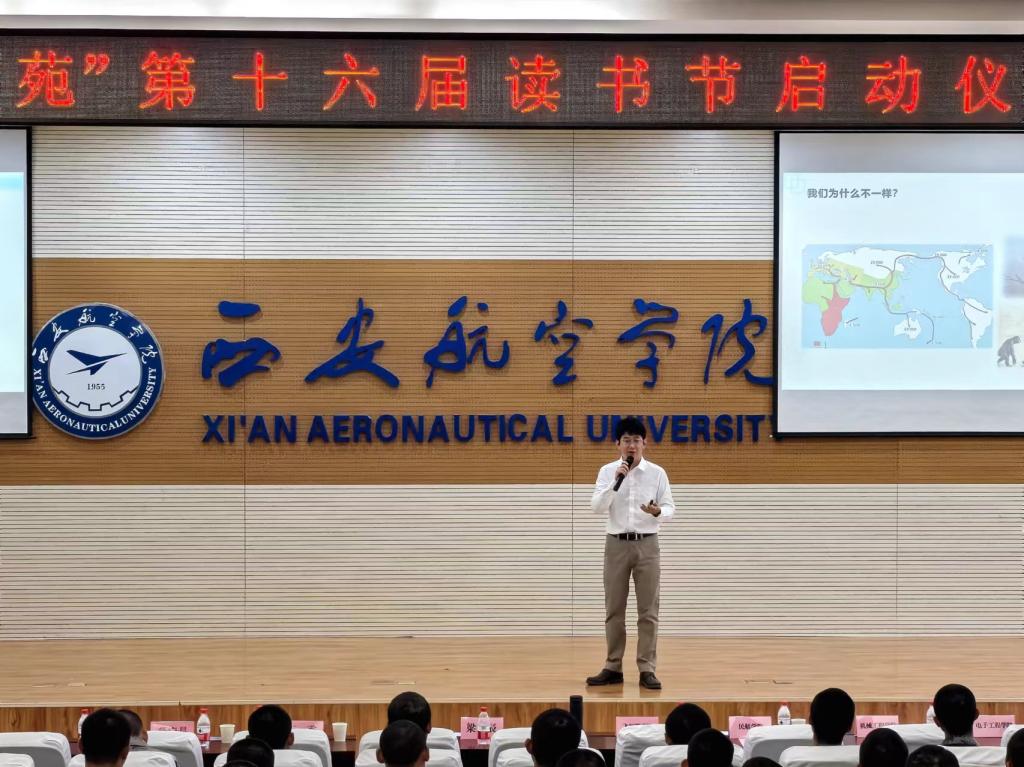 随后梁毅辰与读者协会、小喇叭主持人社团的同学们齐声诵读《礼记•大学(节选)》,琅琅书声,丝竹悠扬,屏幕上、舞台中央“发现书香航苑共建书香校园”画卷徐徐拉开,将仪式推向高潮。梁毅辰以“翱翔书海•探秘蓝天”为题作主题报告,结合自身航空航天科普人的成长经历,讲述阅读积累的故事,建议同学们开展更多的深度阅读、经典阅读。