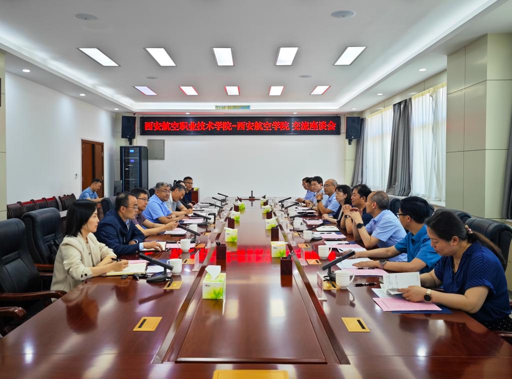 5月9日下午,西安航空职业技术学院党委书记金文一行9人来贝博官网调研交流。校长祁玉龙、党委副书记韩明军,以及党政办公室、人事处、发展规划与学科建设处、教务处、科技处等部门负责人参加了调研座谈会。