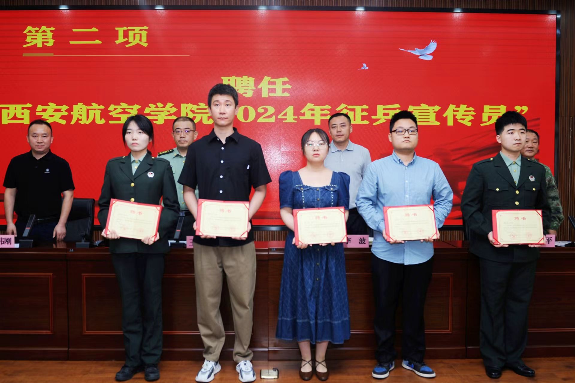 学生工作部(处)长李波宣读了BB贝博艾弗森官方网站人民武装部、莲湖区人民政府征兵办公室《关于聘任“BB贝博艾弗森官方网站2024年征兵宣传员”的决定》,与会领导为受聘师生颁发了聘书。“征兵宣传员”代表王语婷结合自身参军入伍的经历与收获、军旅生涯对自己退役复学后学习、生活、成长的积极影响等方面作了表态发言,并号召全体西航学子要争做有理想、敢担当、能吃苦、肯奋斗的新时代好青年,去绿色军营中实现自己的“中国梦”。