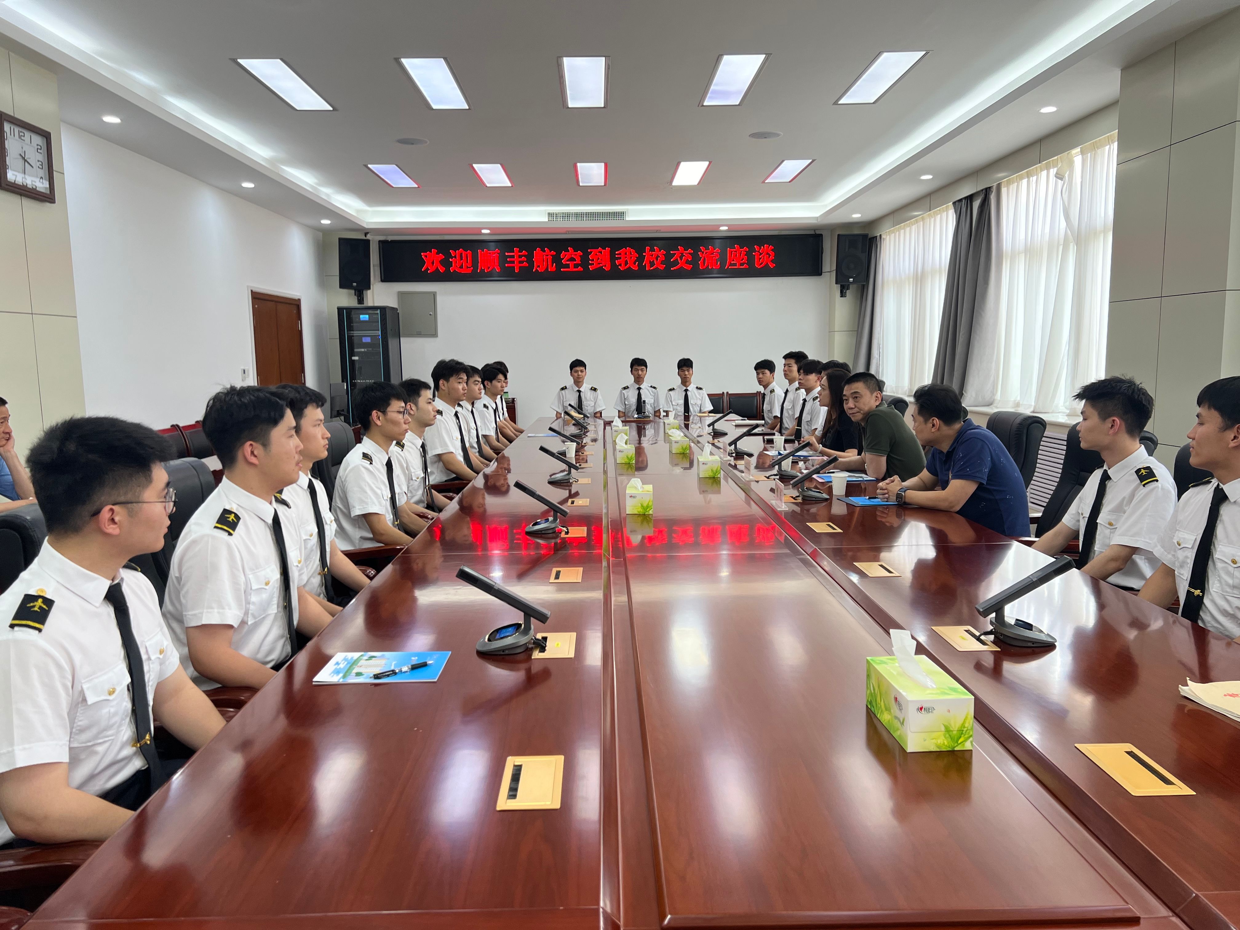 会后,顺丰航空公司一行与全体顺丰学员进行座谈交流,现场气氛热烈,学员们积极提问,顺丰团队耐心解答了大家在薪资、学习、训练和未来职业规划中的种种疑惑,让学员们明确了努力的方向。