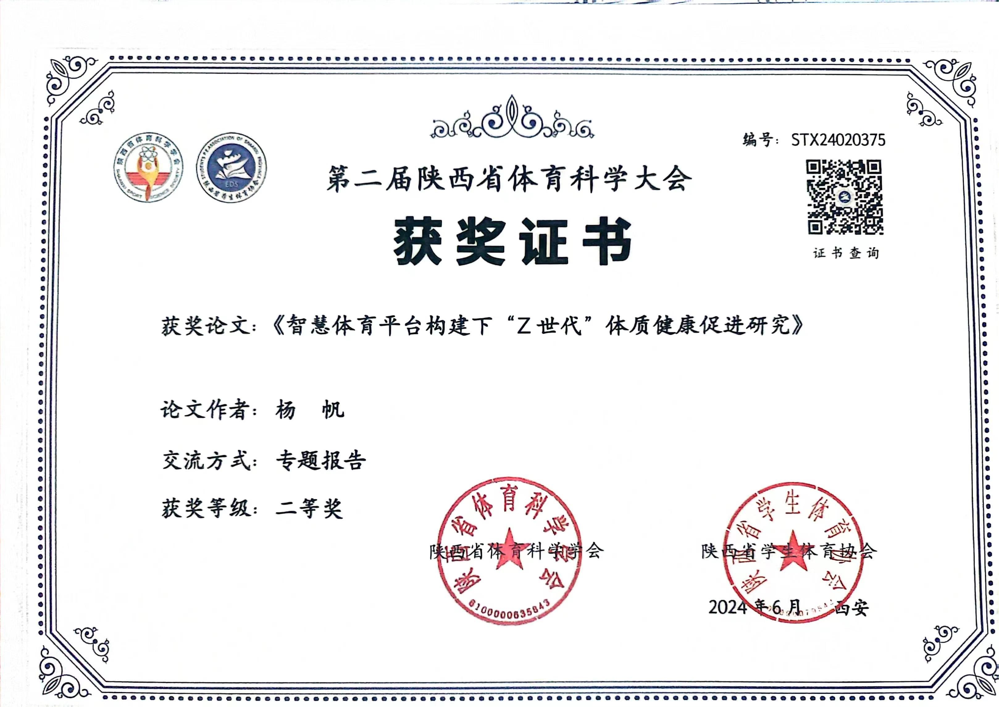 2024年6月22日,陕西省第二届体育科学大会在陕西师范大学隆重召开。贝博官网体育部教师刘易斯、武鑫、杨帆积极参与,凭借其扎实的科研基础和独特的创新理念,荣获二等奖2项,三等奖1项。
