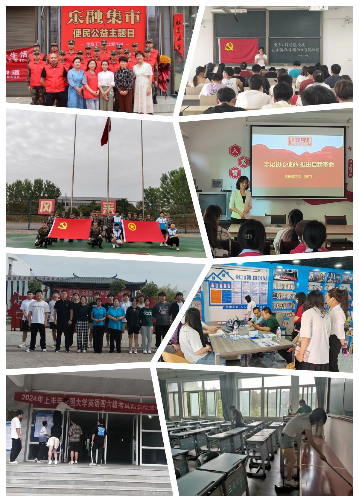 社会实践担使命。为充分发挥党员志愿者联系服务群众作用,引导广大党员践行初心使命,学校各基层党组织在“七一”前夕纷纷组织党员开展丰富多彩的志愿服务活动,用实际行动热烈庆祝建党节。马克思主义学院教师到延光社区为社区干部和老党员讲党课;校团委开展庆“七一”主题升旗仪式;军士学院组织学生党员前往凤凰社区参加“乐融集市,便民公益主题日”服务活动;机械工程学院组织25名青年师生党员为大学英语四六级考试提供志愿服务活动;电子工程学院组织学生党员开展教室卫生大扫除和“保密+反诈+消防+反邪教”知识宣讲活动;车辆工程学院赴西安市阎良区德瑞养老院开展“育人为本德育先行”主题志愿服务活动;驻村干部在镇坪县曾家镇开展了为期2天的高考志愿填报义务咨询活动等等。(文、图/党委组织部 周原 审核/申良)