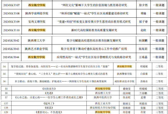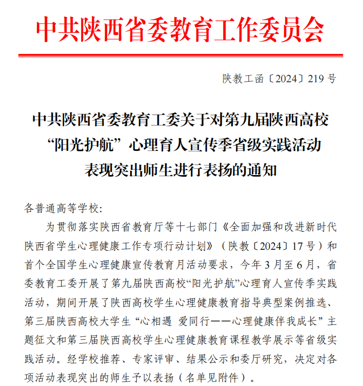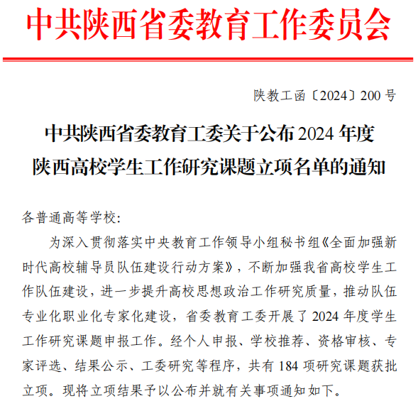 近日,中共陕西省委教育工委公布了2024年度陕西高校学生工作研究课题立项名单、第九届陕西高校心理育人宣传季有关活动表扬名单。