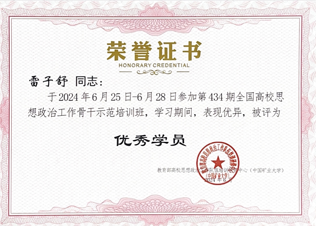 在近日教育部思想政治工作司组织的全国高校思想政治工作骨干示范培训班学习中,飞行器学院辅导员雷子舒较好地展示了贝博官网辅导员良好的专业素养和精神风貌,被评选为“优秀学员”。
