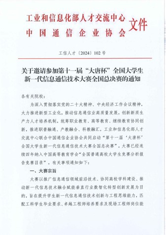 “大唐杯”全国大学生新一代信息通信技术大赛是由工业和信息化部人才交流中心、中国通信企业协会主办,中信科移动通信技术股份有限公司、北京市教委北京高校电子信息类专业群共同组织承办、北方工业大学、北京邮电大学等广大高校协办的全国性创新实践型竞赛。“大唐杯”已被教育部列“全国普通高校大学生竞赛排行榜”竞赛项目,服务于广大高校教师和学生群体,以培养高素质技术技能人才、协同高校学科建设、推动科技创新发展为目标。大赛依托中信科移动深厚的技术底蕴,将专业理论与工程实践相结合,已成为国内信息通信领域最具影响力的创新竞赛项目。