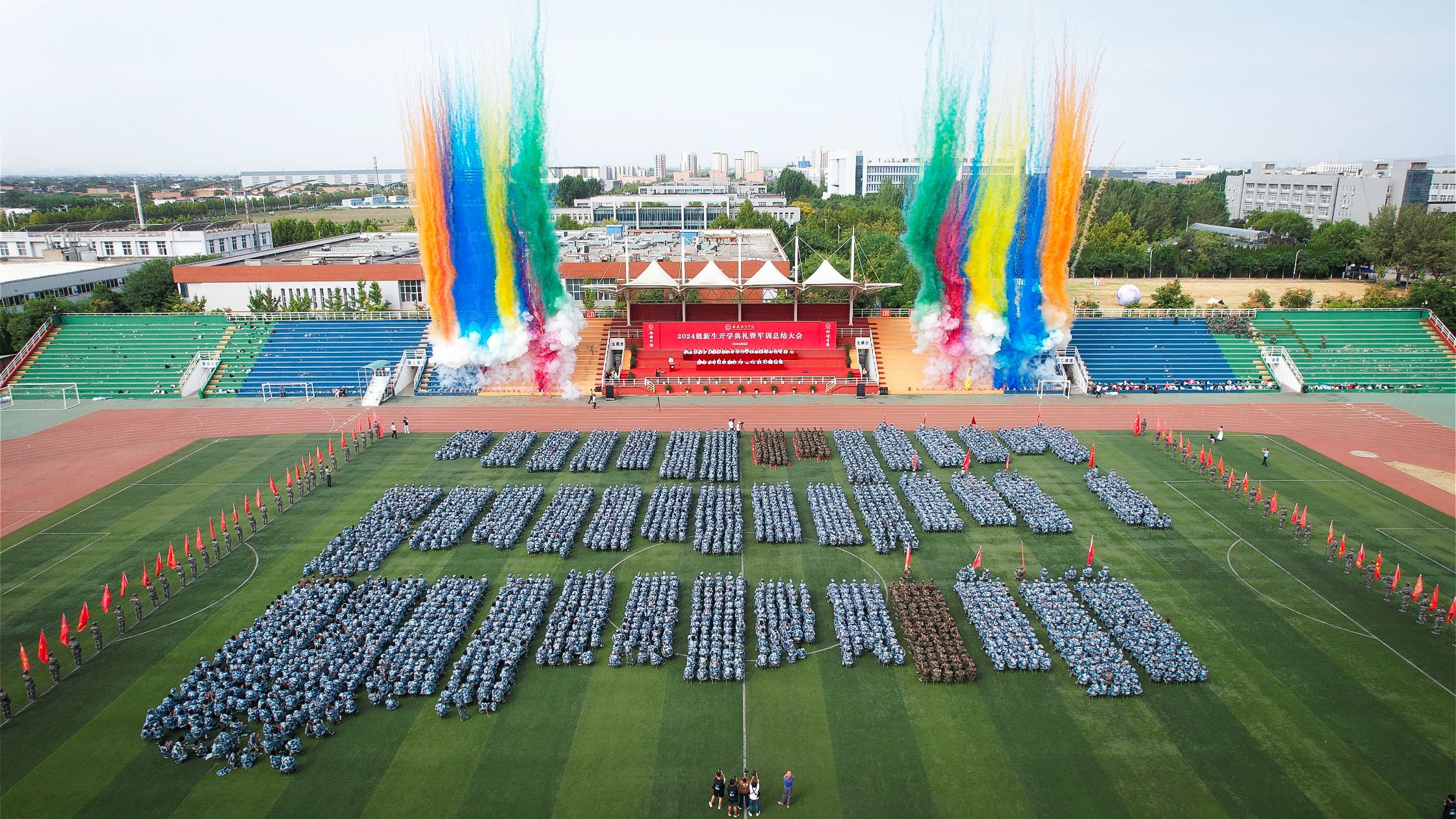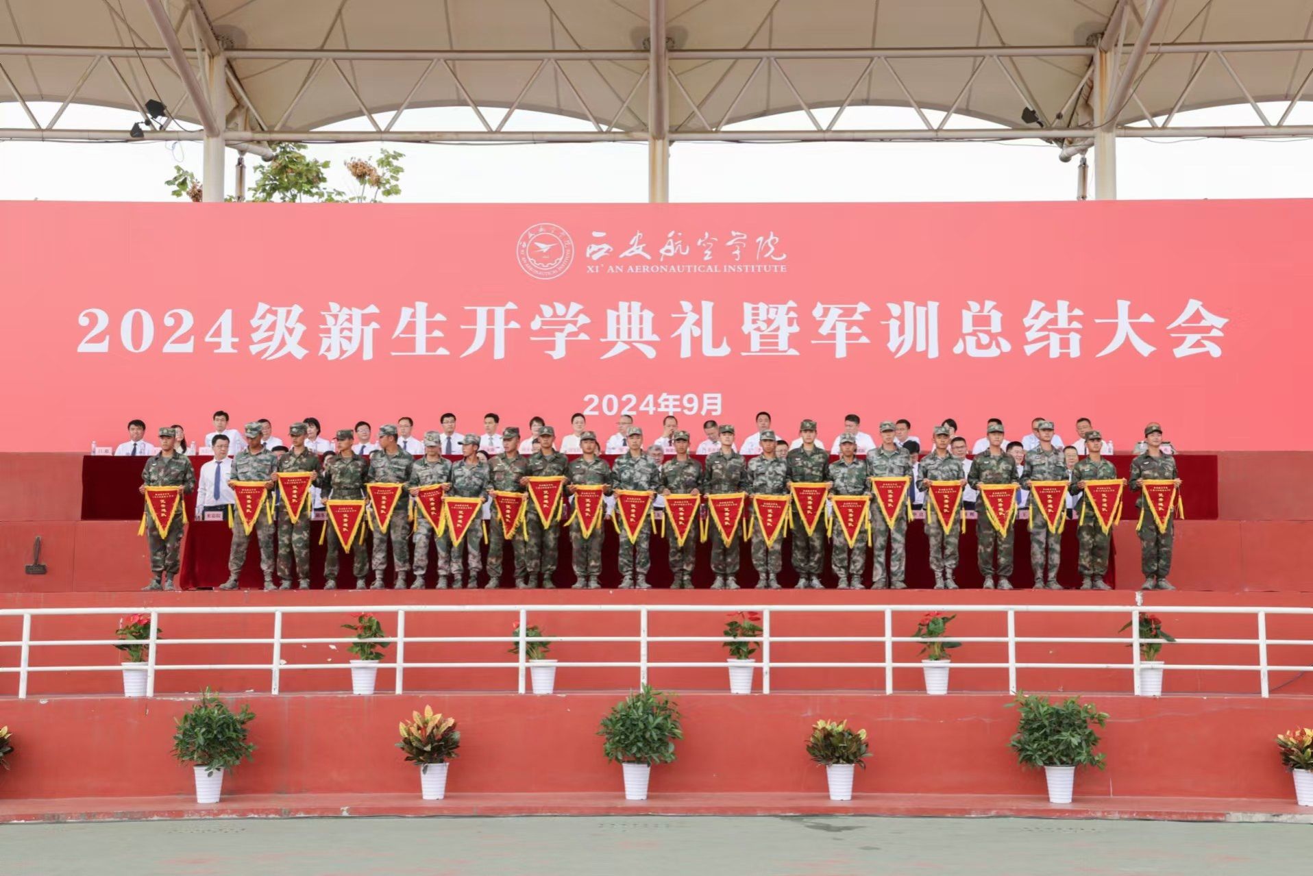 秋风送爽启新程,扬帆远航谱华章。9月14日上午,贝博官网2024级新生开学典礼暨军训总结表彰大会在阎良校区田径运动场隆重举行,来自全国五湖四海的3700余名新生汇聚于此,开启人生新征程。党委书记、校长祁玉龙,党委副书记、纪委书记、监察专员曹渊,副校长宋文学、宁永录,相关职能部门负责人,各二级学院党总支书记、院长,学工办主任、全体新生辅导员及军训教官参加大会。大会由曹渊主持。