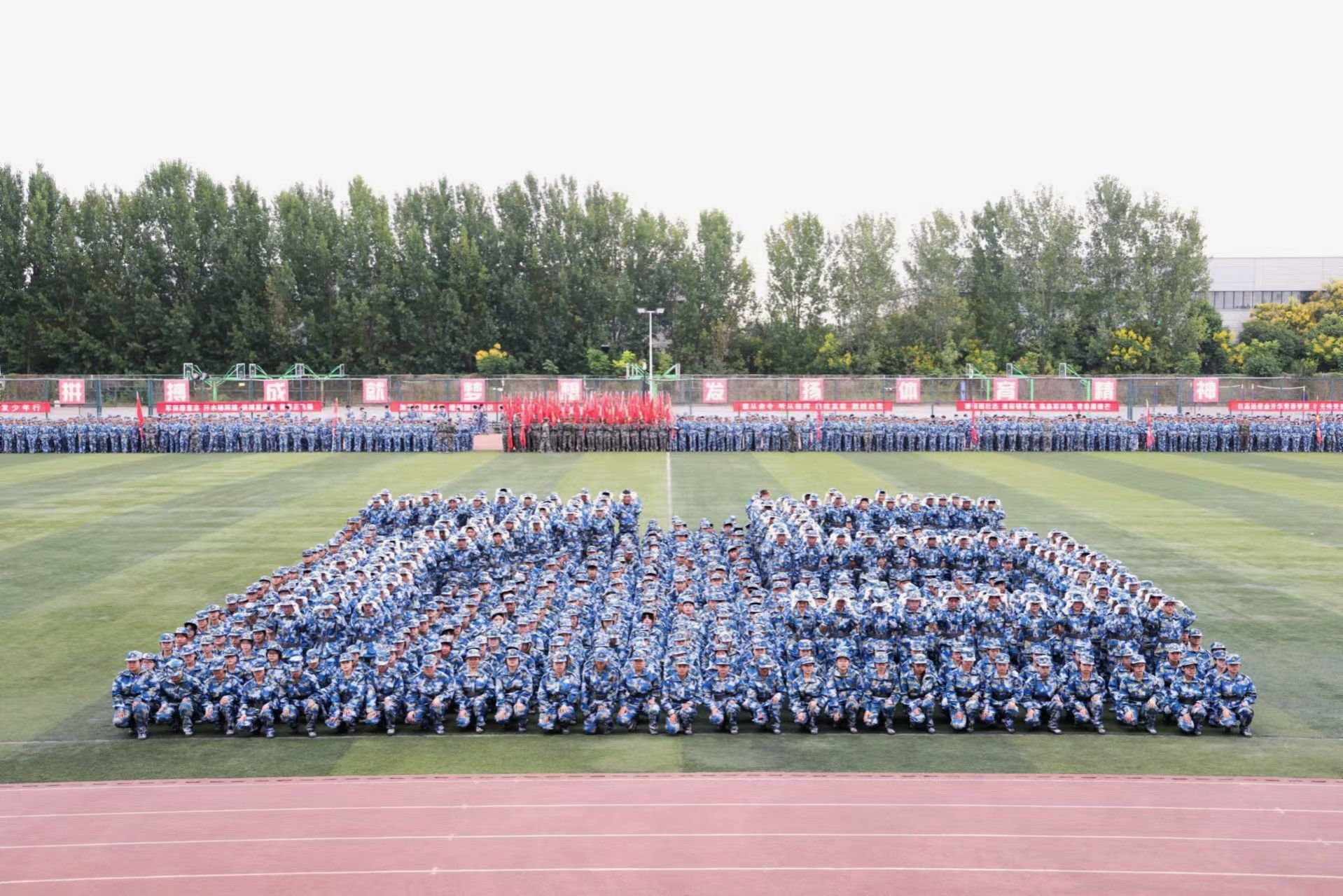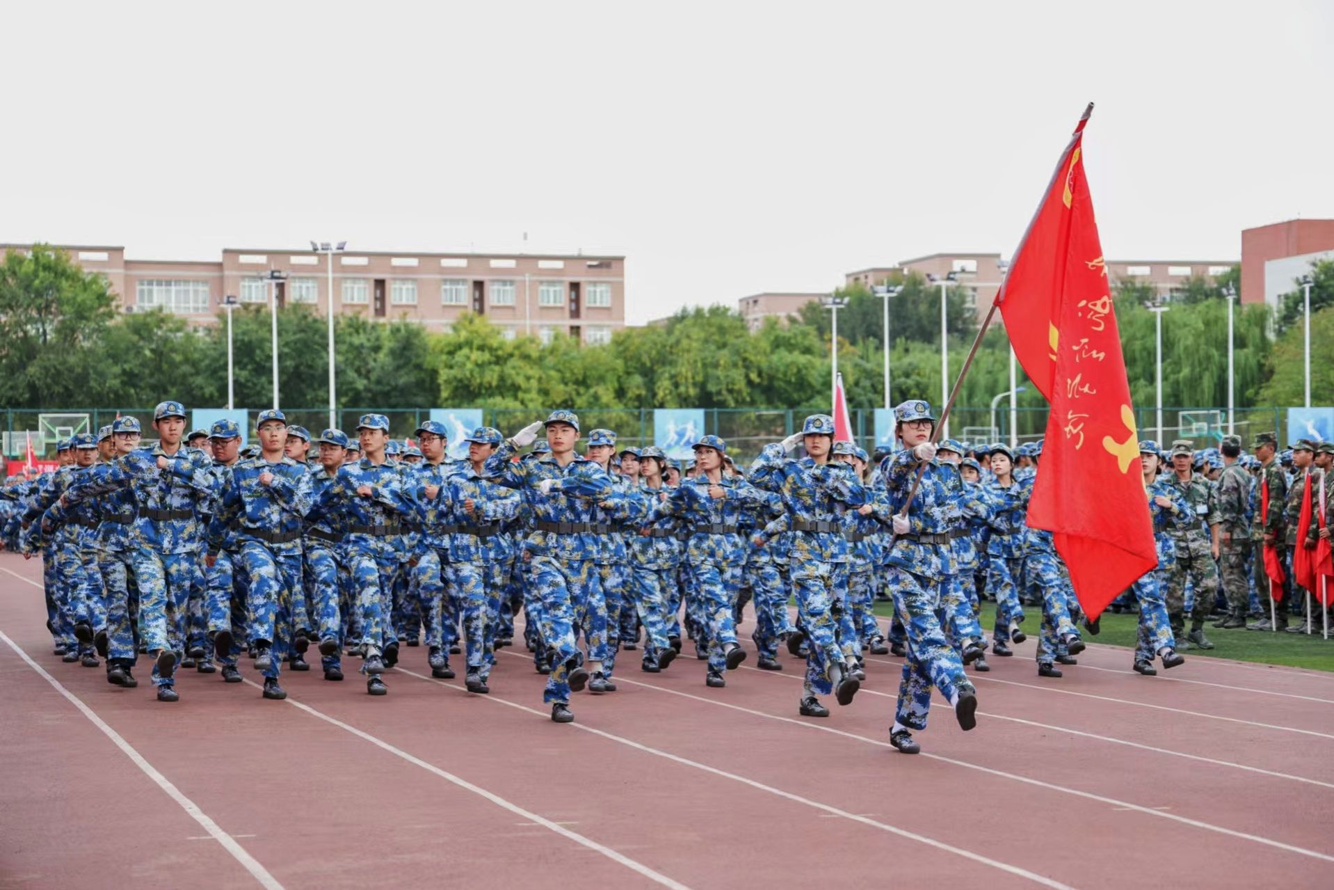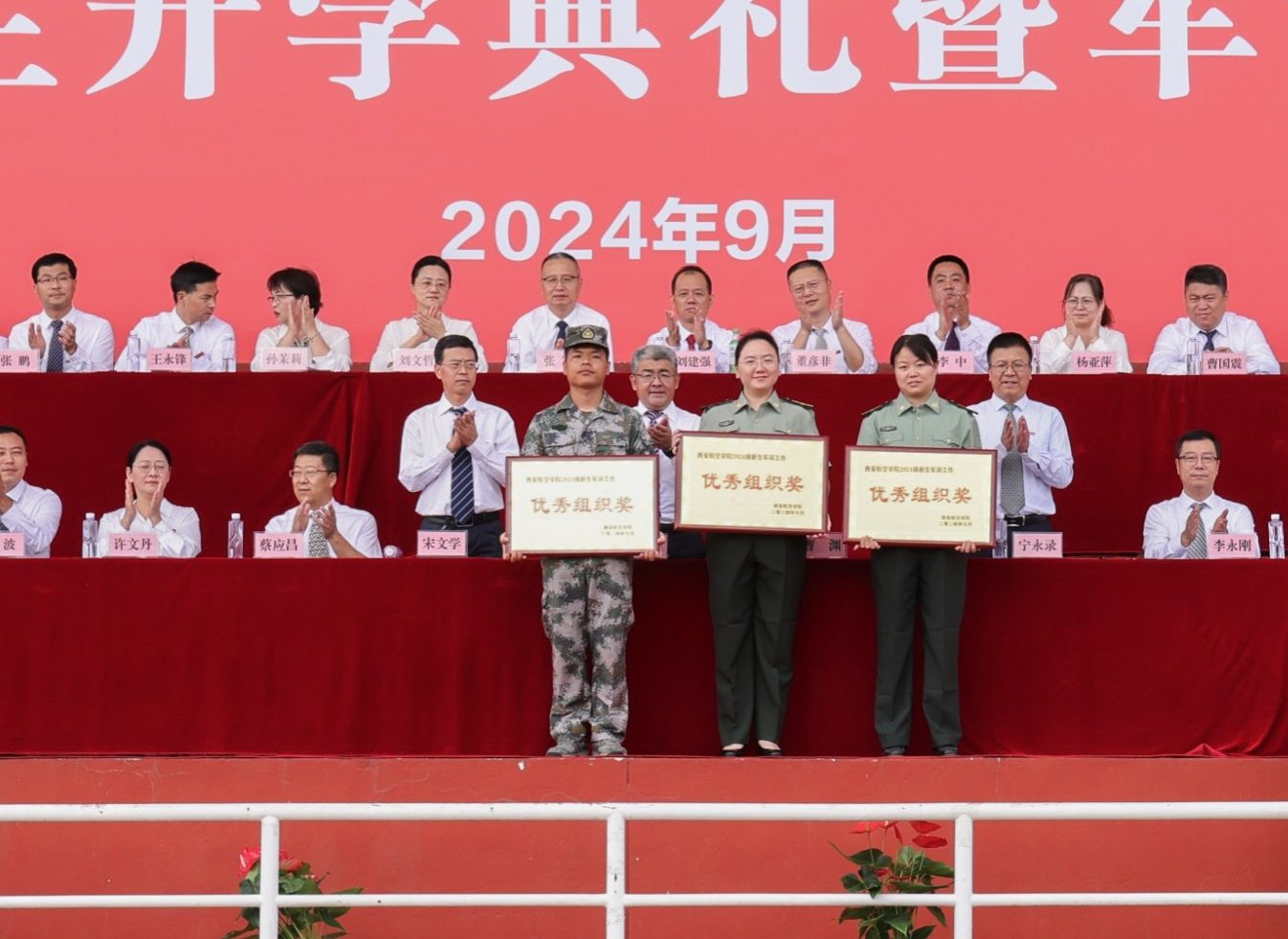 军训汇演结束后,副校长宋文学宣布军训团表彰决定。与会领导为先进连队、先进集体颁发了锦旗和奖牌。