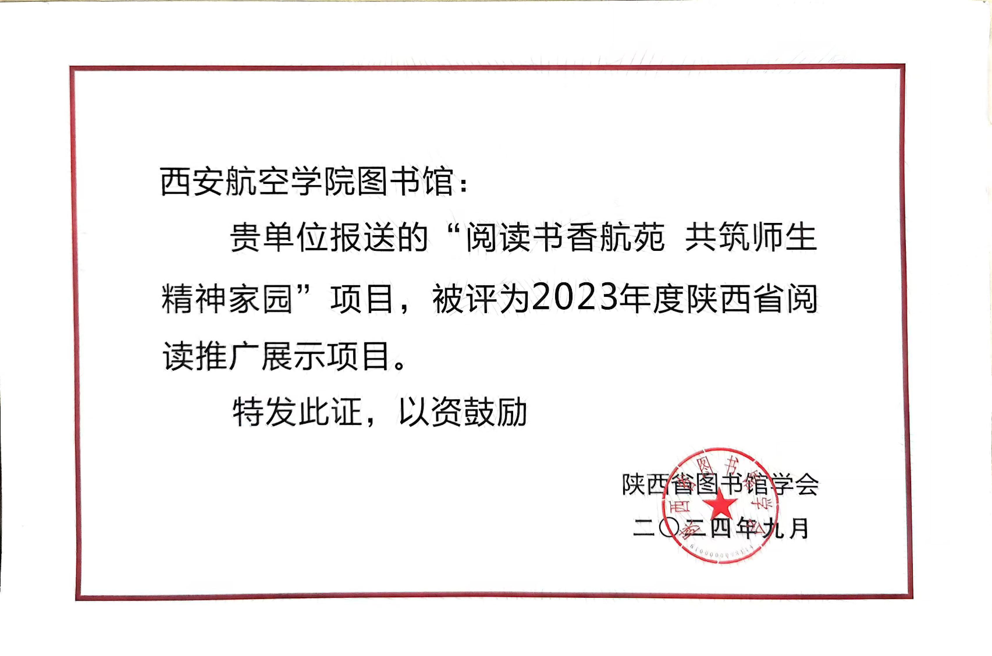 大会表彰了2023年陕西省阅读推广展示项目,贝博官网图书馆报送的“阅读书香航苑 共筑师生精神家园”获评2023年度陕西省阅读推广展示项目。
