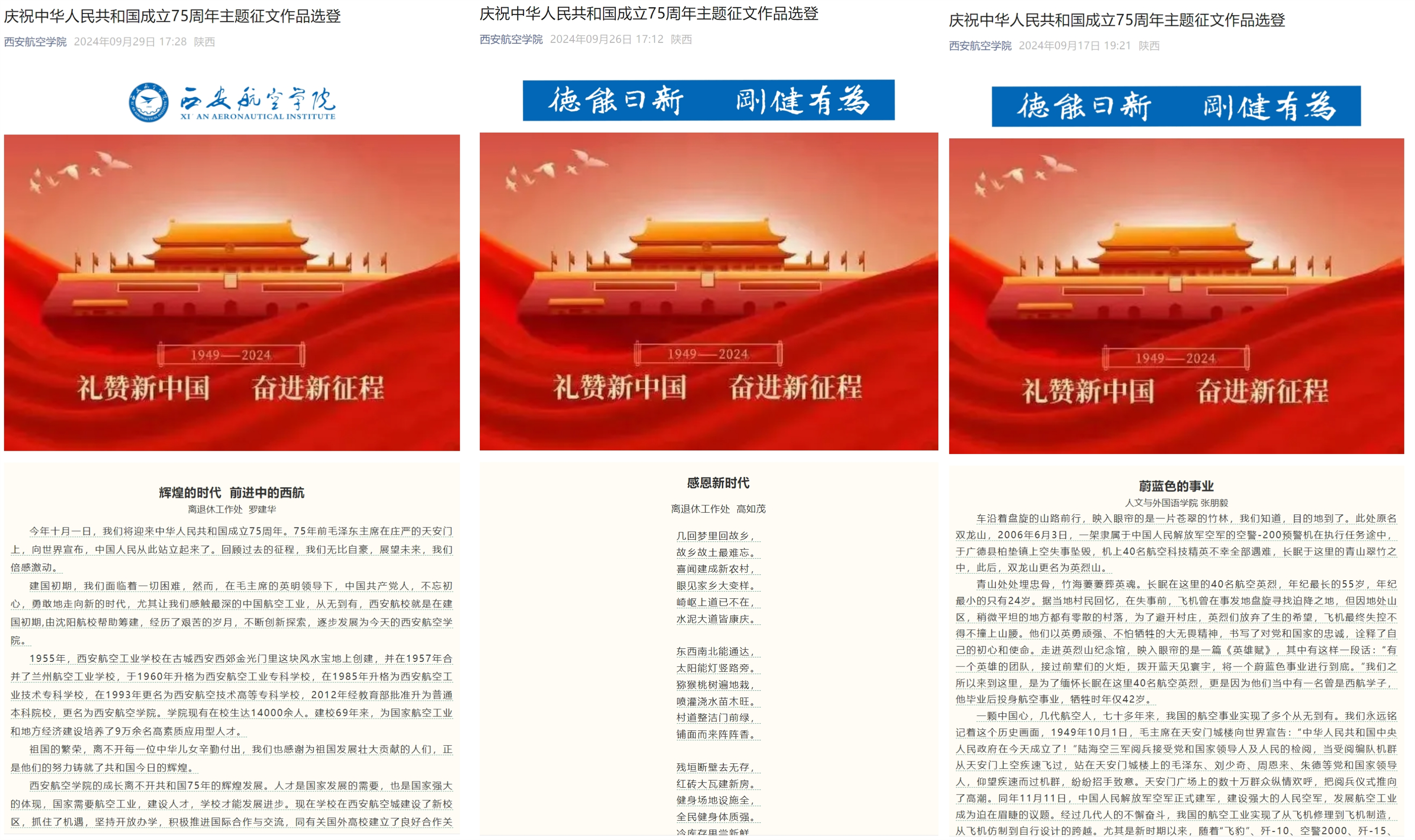 4月至6月,党委宣传部联合人文与外国语学院开展了庆祝中华人民共和国成立75周年主题征文活动。全校师生和离退休老同志积极响应,共收到小说、散文和诗歌作品246篇,记录西航人与祖国共成长、同奋进的感人故事,引导激励广大师生传承红色基因,展现西航人爱党爱国爱航空爱校的赤子之情。