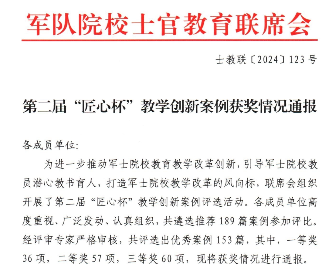 近日,第二届“匠心杯”教学创新案例评选活动圆满举行。贝博官网在此次大赛中成绩优异,共斩获一等奖、二等奖、三等奖各1个,在获奖数量及等级上都实现了突破,彰显了贝博官网在军士人才培养方面的成效。