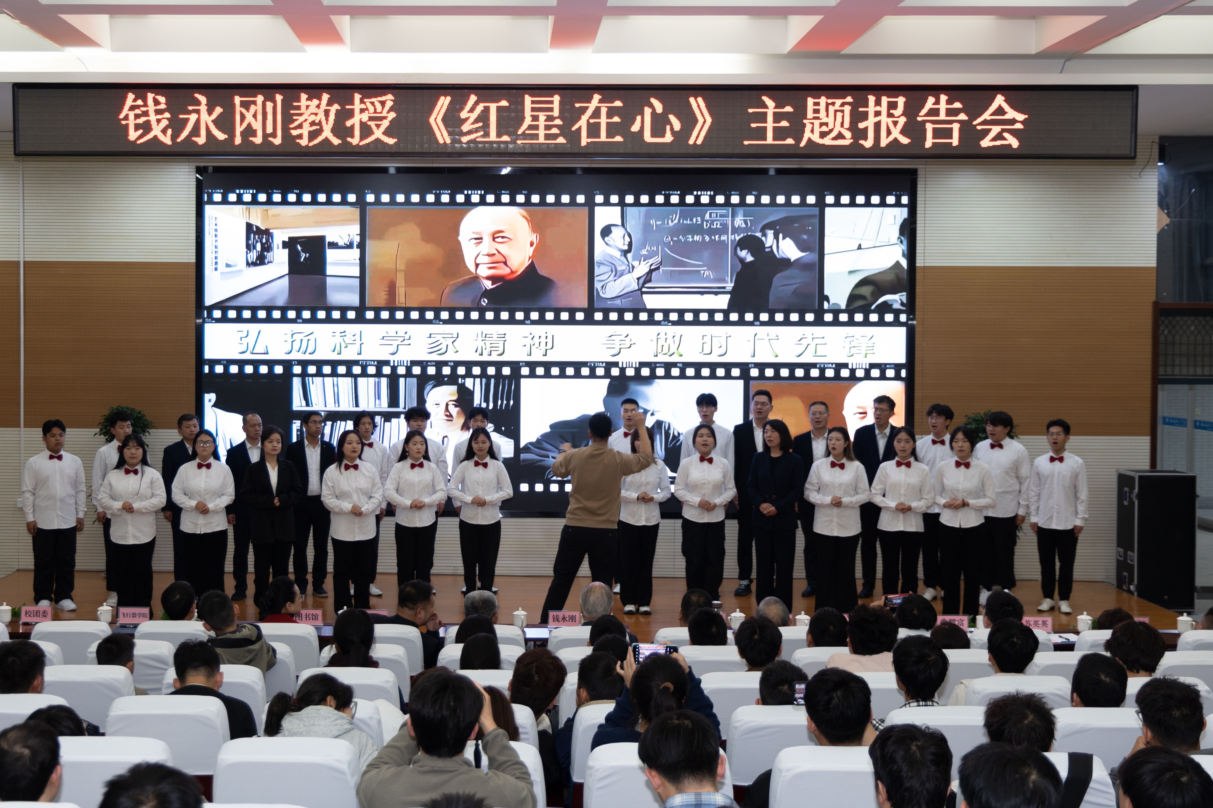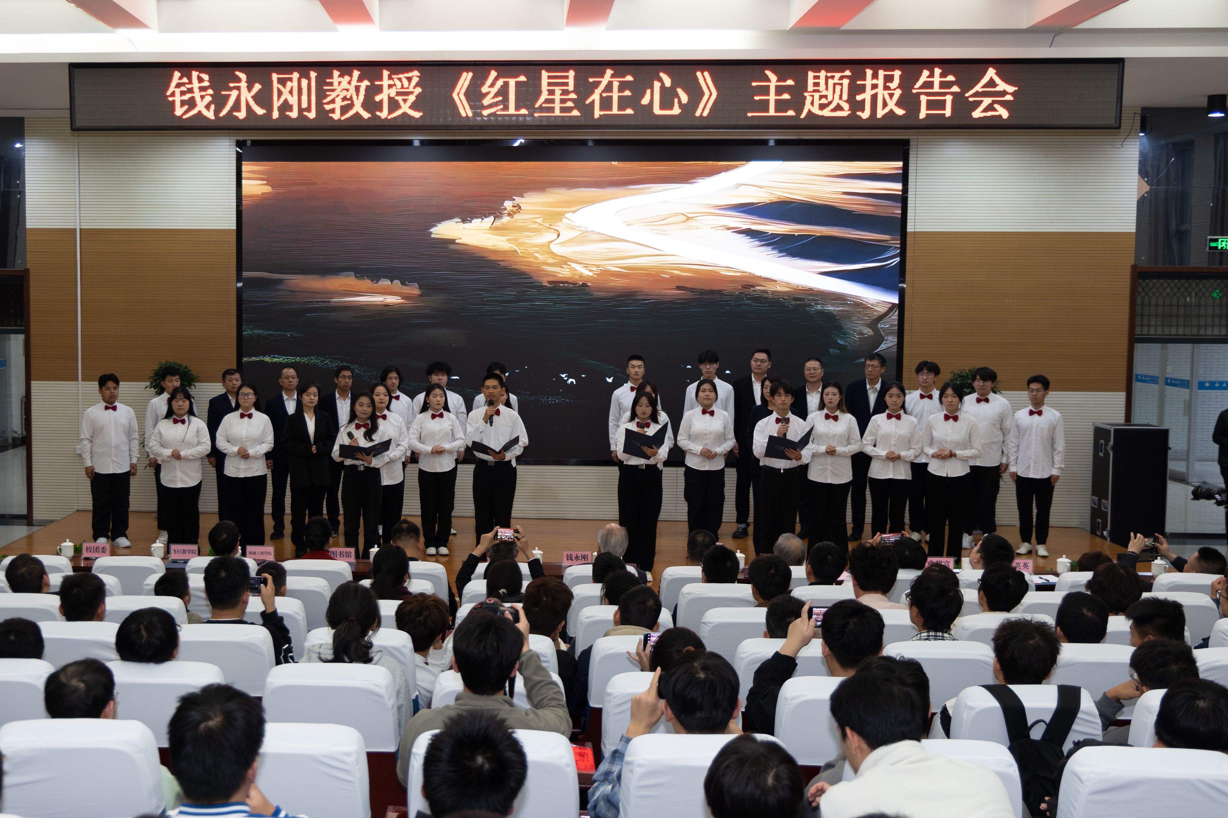 报告会后,飞行器学院教师和大学生艺术团学生共同合唱了大型人物传记文献纪录片《钱学森》的主题曲《飞翔的路》,共同希望将《飞翔的路》这首歌作为贝博官网“钱学森班”班歌,让钱学森爱国、奉献精神和“大成智慧”教育思想在西航代代传承,永放光芒!