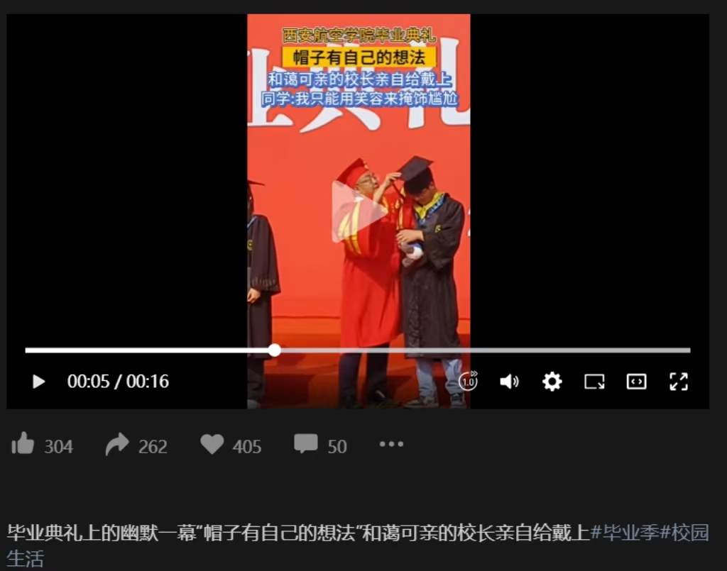 “毕业典礼上的幽默一幕‘帽子有自己的想法’和蔼可亲的校长亲自给戴上”视频