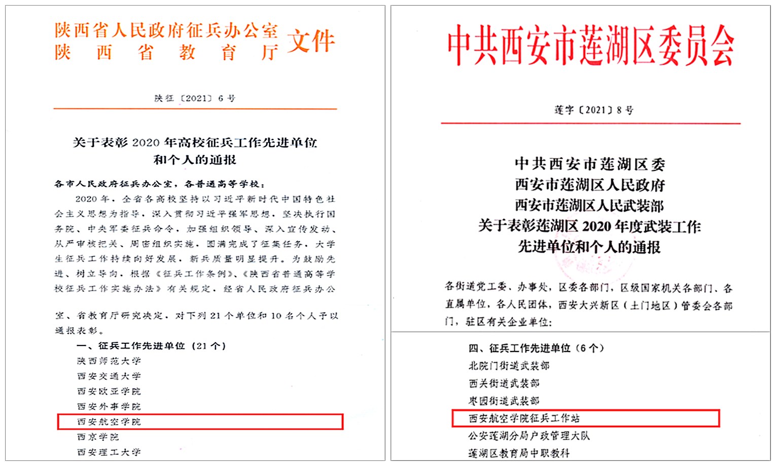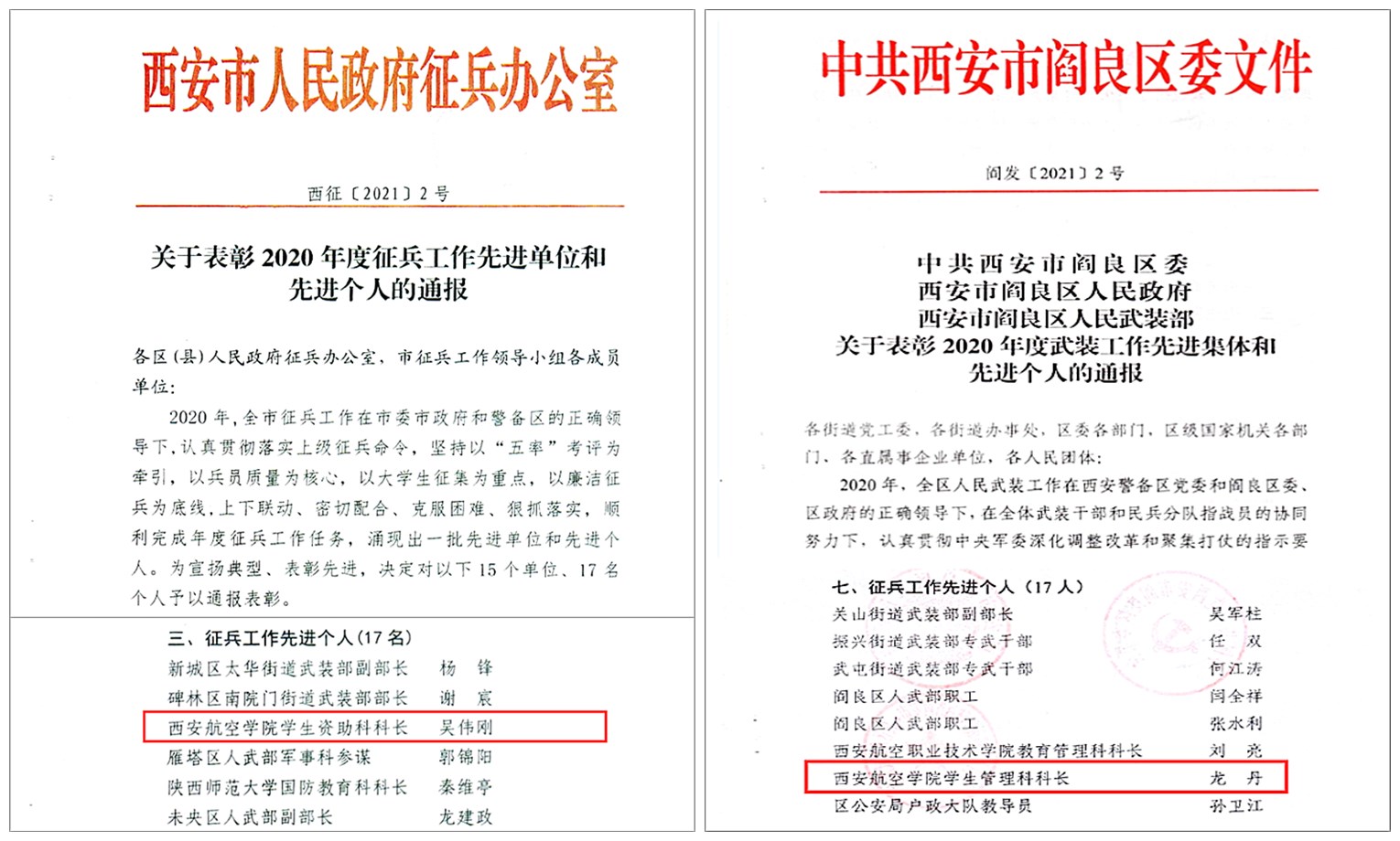 近日,陕西省人民政府征兵办公室、陕西省教育厅、西安市人民政府征兵办公室及中共西安市莲湖区委、中共西安市阎良区委分别发文,对在2020年征兵工作中表现突出的单位和个人通报表彰,贝博官网荣获陕西省征兵工作先进单位、莲湖区征兵工作先进单位,吴伟刚荣获西安市征兵工作先进个人、龙丹荣获阎良区征兵工作先进个人。