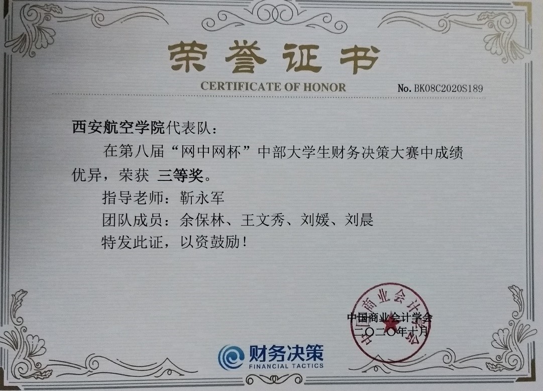 10月25日,由中国高等教育学会高等财经教育分会指导、中国商业会计学会主办、厦门网中网软件有限公司等提供技术支持的第八届“网中网杯”全国大学生财务决策大赛正式开幕。受疫情影响,本届比赛采取线上方式进行。贝博官网选派的四名学生参赛,获得三等奖。