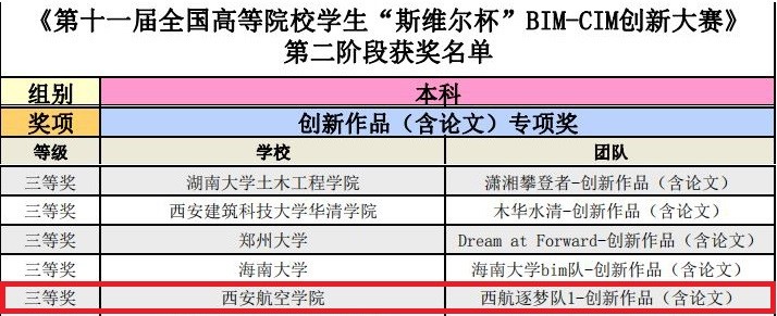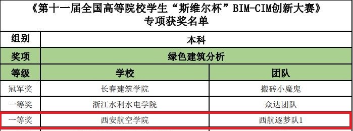 近日,由中国建设教育协会主办,深圳市斯维尔科技有限公司、湖南大学承办的中国建设教育协会第十一届全国高等院校“斯维尔杯”BIM-CIM创新大赛第二阶段决赛线上答辩结果公布。由能源与建筑学院权张涛、王虎星、唐烨、裴冲、李佳乐五名学生组成的贝博官网西航逐梦队取得了绿色建筑专项一等奖、规划设计专项三等奖、工程管理专项三等奖、第一阶段全能三等奖、第二阶段创新作品三等奖的佳绩,在陕西参赛院校中名列前茅。