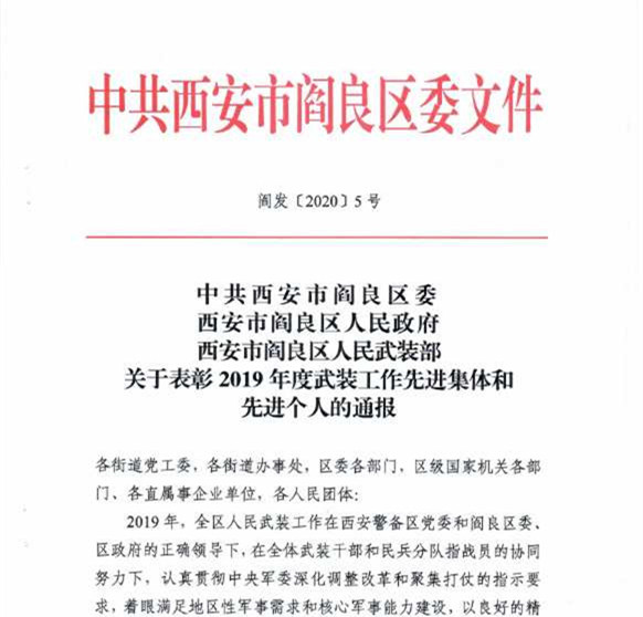 近日,中共西安市莲湖区委、区人民政府、区人民武装部,中共西安市阎良区委、区人民政府、区人民武装部对在2019年征兵工作中表现突出的单位予以表彰通报,贝博官网荣获莲湖区、阎良区2019年度征兵工作先进单位,吴伟刚、龙丹分别荣获莲湖区、阎良区征兵工作先进个人。