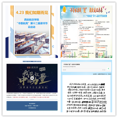 本届读书节以线上活动为主,安排了“青春告白祖国”即兴演讲比赛,“我绘我书”书写喜爱的图书的书名、手绘图书封面,赞“主播”老师、感受“云端”暖阳,“见证中国力量”主题图书推荐、视频讲座、朗诵系列活动,走进院系嵌入服务教参及数字资源培训,以及共读一本书、主题图像创意设计征集、“蛀书虫”阅读挑战赛、阅读答题挑战赛、读者满意度调查、“阅读之星”及读者协会优秀会员评选等内容丰富、形式多样的阅读活动。