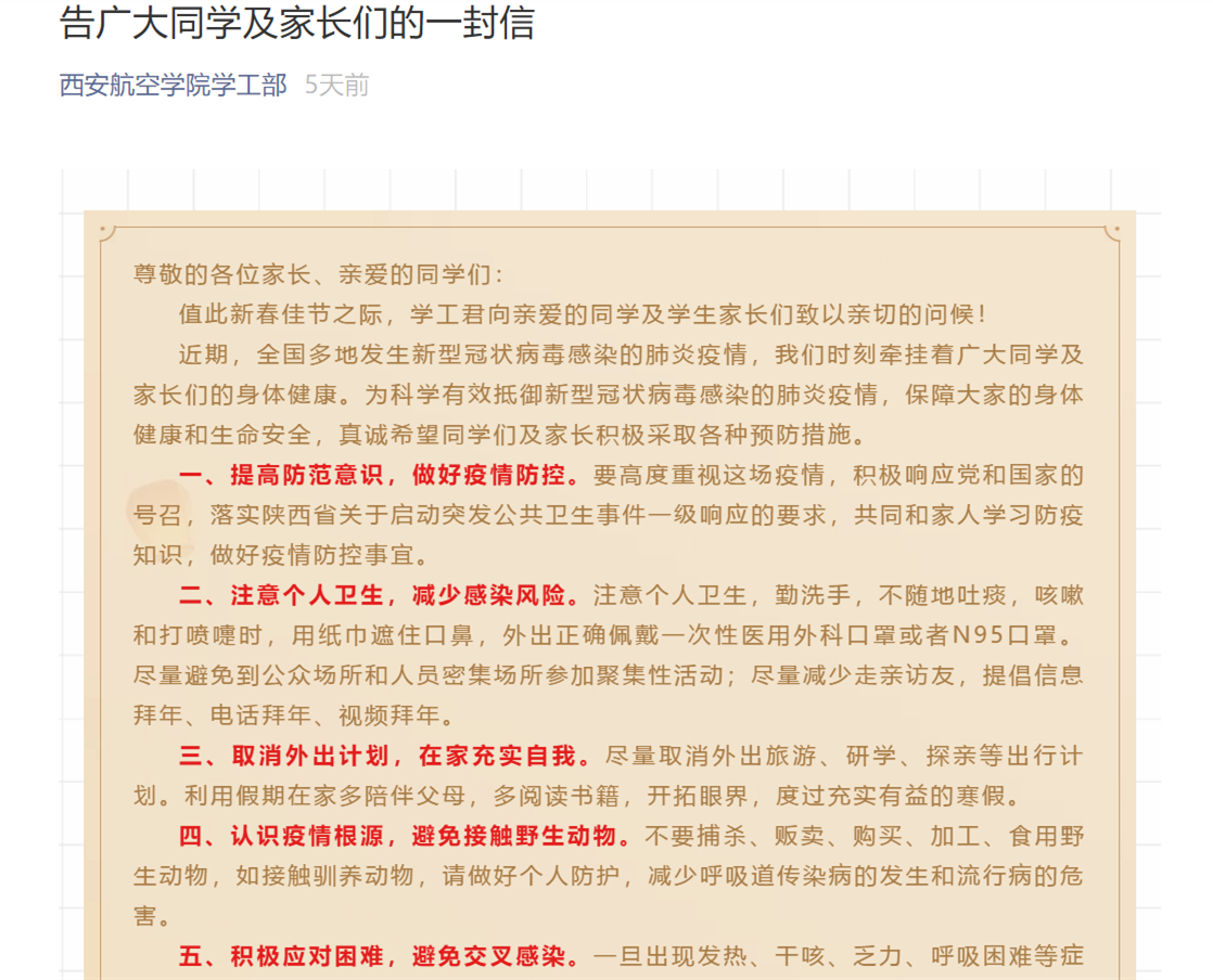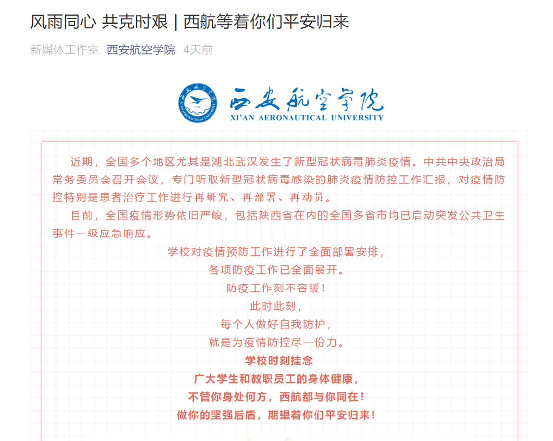 加强宣传教育。党委宣传部、学生工作处、离退休工作处、各二级学院通过学校网站、官方微博、微信公众号、QQ工作群等渠道,面向全体师生员工,及时传达中省和学校有关文件精神,发布校内疫情防控信息,推送“风雨同心、共克时艰,西航等着你们平安归来”“我是西航人,我承诺”“疫情防控指南”“告广大同学及家长的一封信”“致全体离退休职工的倡议书”等信息,向师生和家长普及疫情防控知识和防控要求,及时引导广大师生员工积极响应国家号召和防控部署安排,履行公民义务,积极应对疫情防控。