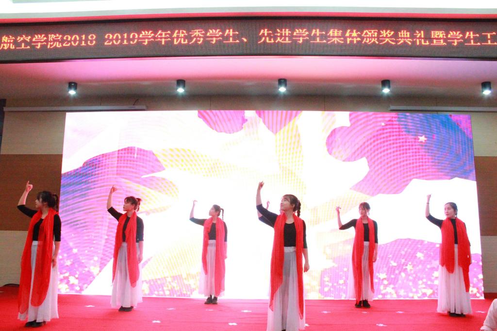 人文学院学生表演了荣获2019年陕西省百佳慕课作品特等奖的手语操《我们都是追梦人》。现场还播放了《星光闪耀》《榜样力量》《燃青春聚能量》《青春建功》《凝初心 铸未来》《航空报国 逐梦蓝天》等励志短片。