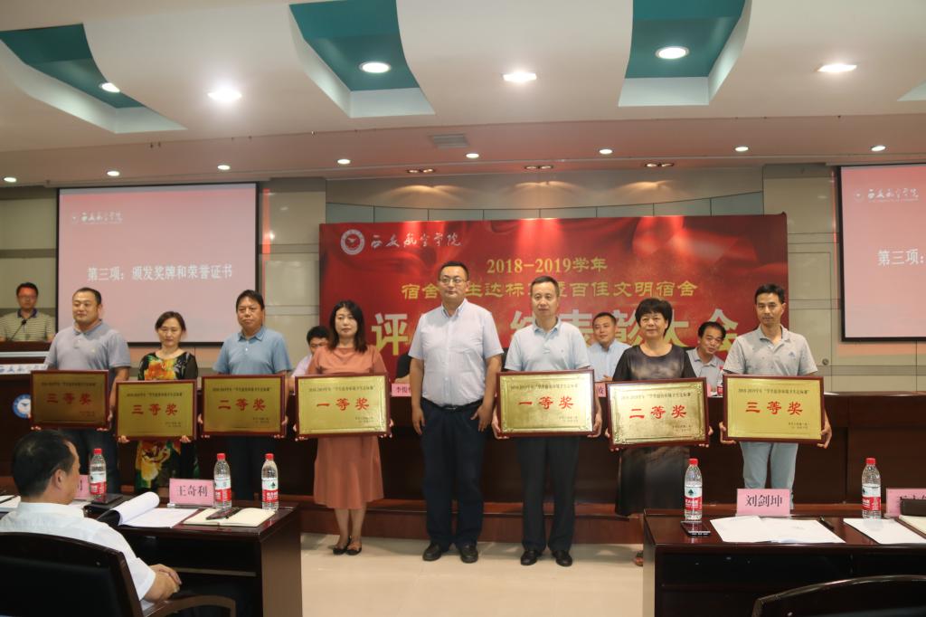 6月26日,学校在沣惠校区召开2018-2019学年“学生宿舍环境卫生达标赛暨百佳文明宿舍”评比总结表彰大会。党委副书记刘谦,学生工作部(处)、后勤保障处、保卫处、教务处、校团委等职能部门负责人,各二级学院党总支书记、学生管理科科长、辅导员及学生代表共200余人参加了此次大会。会议由学生工作部副部长赵琳主持。