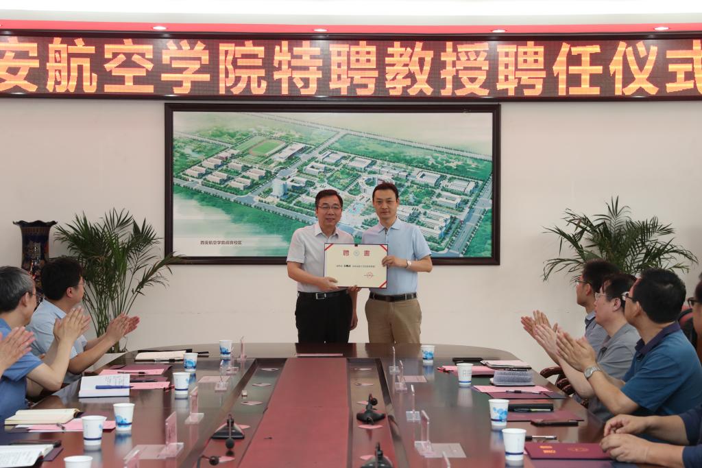 宋文学介绍了郑召利教授、吴耀武教授的基本情况。陈平社分别为两位特聘教授颁发聘书。受聘教授一致表示,今后将共同肩负立德树人使命,为航空人才培养和学校学科专业建设与发展、人文素质教育及青年教师成长贡献力量。