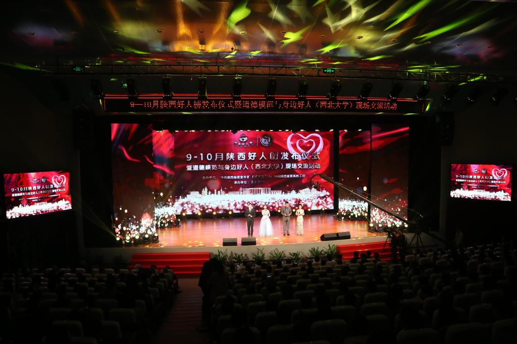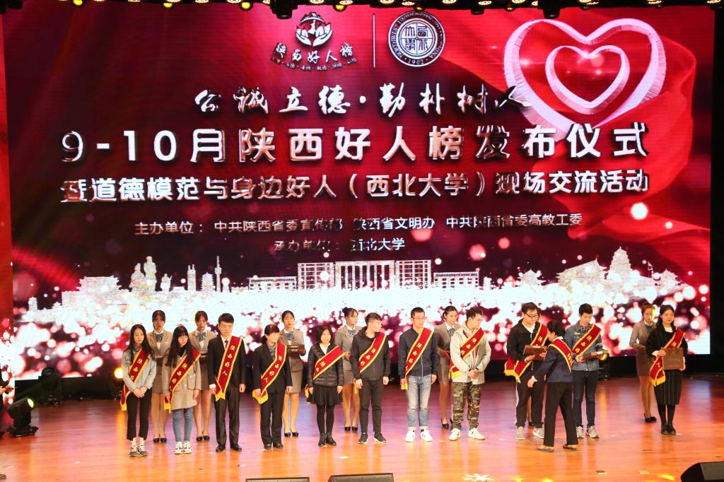 省委宣传部副部长长程宁博、省委高教工委副书记陈乃霞和西北大学校领导为9-10月陕西好人榜揭榜。当23位陕西高教系统身边好人代表步入会场时,全体观众起立鼓掌,向他们致以崇高的敬意。侯党社、郭乐源等我省高教系统中国好人、陕西好人代表与现场观众分享了他们的感人事迹。歌舞、朗诵、音乐情景剧等精彩节目展现了我省高校师生“学习好人、争做好人”的良好风貌。现场举行了陕西好人榜主题旗帜交接,2018年11-12月陕西好人榜发布仪式将在蓝田县举行。