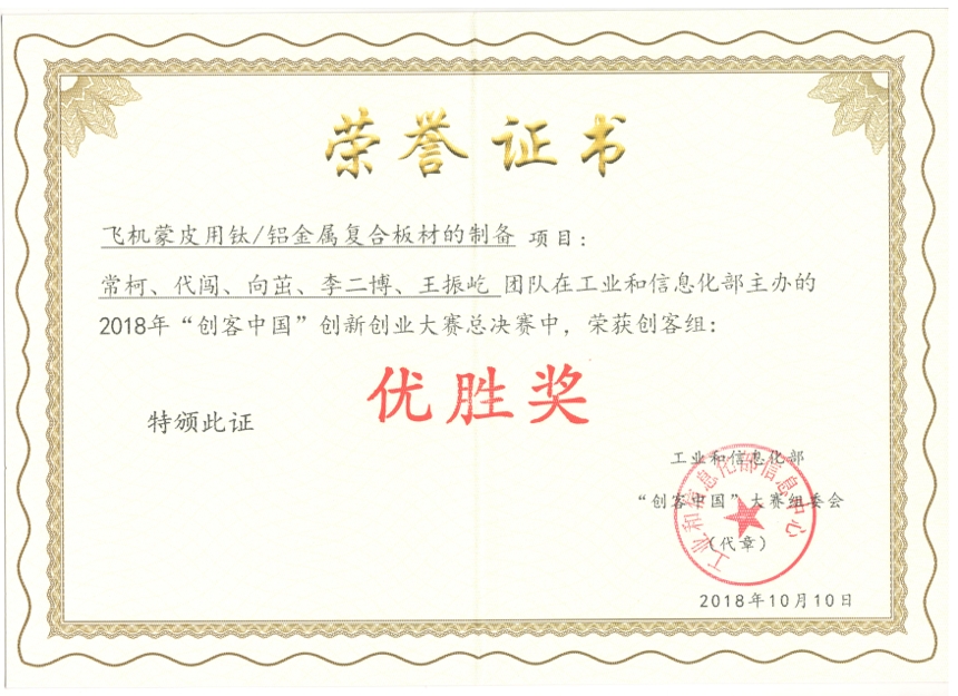由工业和信息化部主办、工业和信息化部信息中心与广东省经济和信息化委员会联合承办的2018年“创客中国”创新创业大赛全国总决赛在广州举行。本次大赛全国范围内共组织参赛项目8000多个,陕西省仅有2个项目进入全国200强,其中贝博官网材料工程学院丁旭教授团队指导的项目《飞机蒙皮用钛/铝金属复合板材的制备》入围全国24强(“企业组”和“创客组”各12强),并作为陕西省唯一的项目入围“创客组”12强。经过全国总决赛现场展示和路演,贝博官网项目获得2018年“创客中国”创新创业大赛全国总决赛“创客组”第8名,同时荣获大赛“优胜奖”。