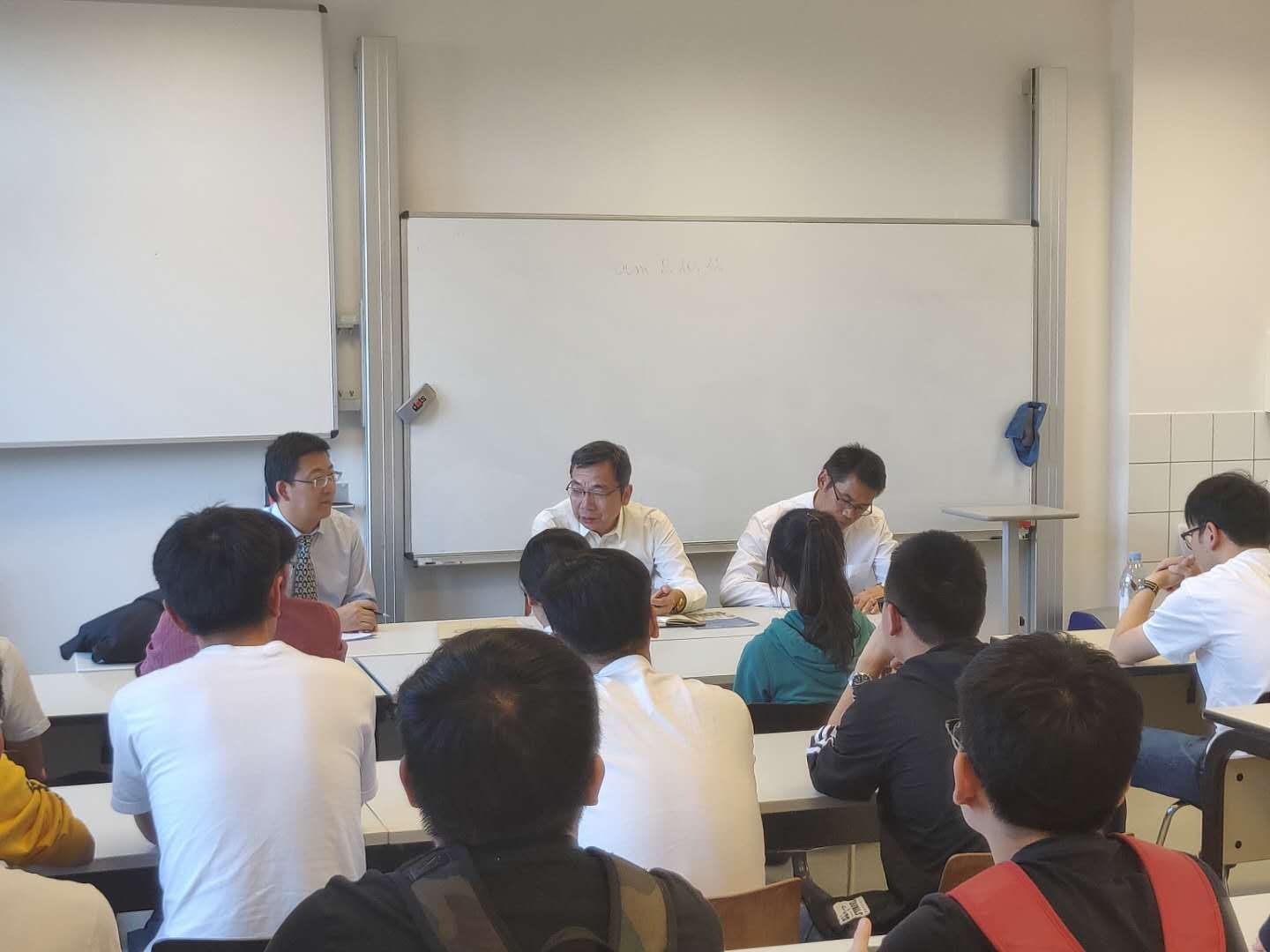 陈平社一行还专程看望了贝博官网中德合作班在德学习学生,并召开座谈会,详细了解同学们在德学习期间思想、学习、生活等方面的情况,勉励大家要珍惜时光、团结奋斗、爱国爱校、树立形象、肩负责任,并送上“德能日新,刚健有为”校训亲笔书法和中秋节的问候。