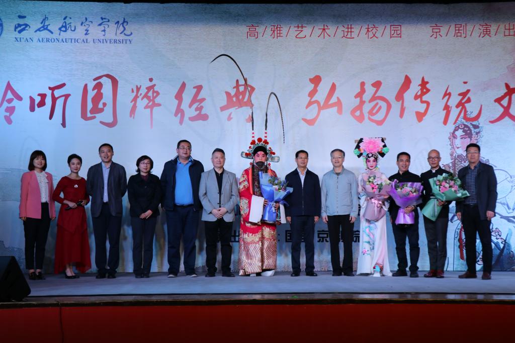 演出结束后,贝博官网学生代表向国家京剧院的演出人员献花致敬。出席领导与演员合影留念。