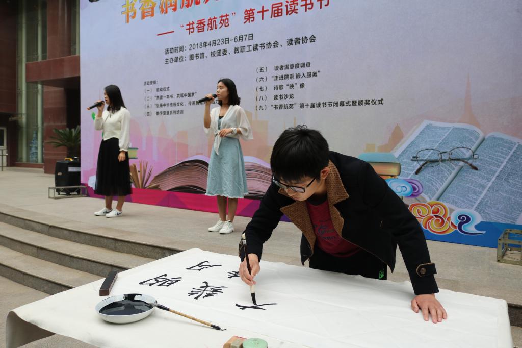 最后,图书馆读者协会学生代表唐明定、梁娜、张欢、王浩等15人为大家诵读了国学经典《论语·学而》篇。声乐部赵晶、李星琪同学演唱了歌曲《水调歌头·明月几时有》,在两人演唱的同时,书画社王印和杨富文同学带来了精彩的书法表演,赢得了满堂喝彩。(文、图/图书馆 刘筱月 柴源 学生记者团)