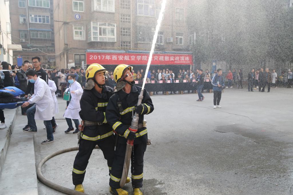 演练模拟贝博官网3#学生公寓发生火险,从学生发现火情报告公寓值班人员,值班人员通过 “报警柱”向“校园报警中心”报告火情,同时鸣响警报,打开公寓所有出口,指挥全体同学向楼外疏散。报警中心接警后即刻指挥贝博官网安保人员及学生义务消防队员迅速赶往现场开展初期灭火,同时根据火情,拨打“119”报告公安消防队,最终消防队接警赶到学校用大型消防车扑灭火灾。整个演练由学校保卫人员、有关二级学院辅导员、学生干部、3#公寓值班员、安全员、卫生所医务人员、3#公寓全体女生、义务消防志愿者、公安莲湖消防四中队消防人员等共2000余人、两台消防车辆参加演练。