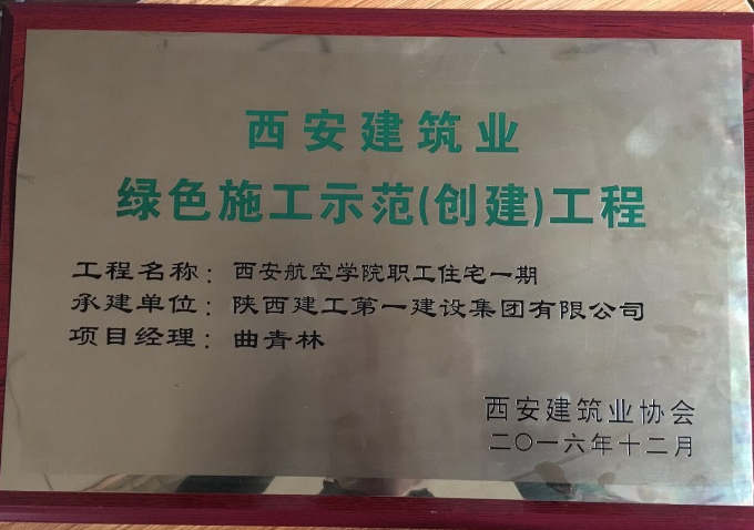 在施工、监理、建设等单位的共同努力和配合下,贝博官网职工住宅一期工程被评为 “2016年度陕西省建筑业绿色施工示范工程”“西安建筑业绿色施工示范(创建)工程”和“莲湖区2016年冬防期建筑工地治污减霾暨安全生产工作会观摩工地”。