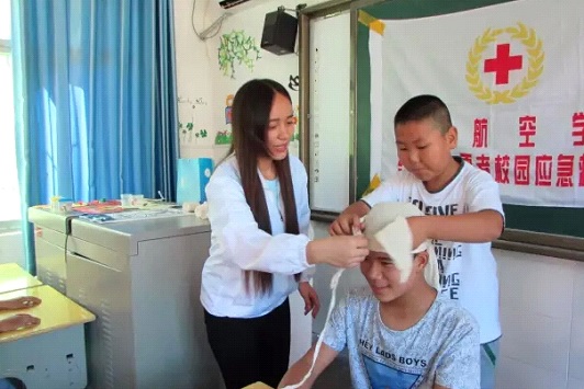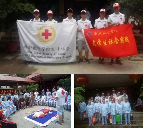 由学校学生红十字会志愿者们组建的“放心爱”社会实践队,他们坚信“青诚筑梦 生命因奉献而精彩”,十多名志愿者分赴四川省乐至县及陕西省镇坪县洪石小学开展民情调研、救护培训活动,活动为期十天。他们深入村庄、社区、敬老院、孤儿院、小学课堂,与那里的孤寡老人、留守儿童、社区中心、政府部门、助贫好人积极接触、倾心交流,走访调研中,体察民情、了解社会;行程中,乐至县孤儿院负责人黄阿姨的爱心事迹最让志愿者们牵挂感怀,黄阿姨以一己之力,用自己的大爱和奉献18年来持之以恒资助关怀当地困难儿童,在她创建的孤儿院里,一批又一批孩子在这里温馨成长直至为人父母、回报社会,走访中,志愿者们自发鞠躬致敬黄阿姨。与此同时,志愿者们倾情奉献专业所学,所到之处积极开展初级救护知识培训及禁毒宣传教育等实践活动,内容包含:头部、手部、截肢、单双肩、单双胸的创伤处理和包扎方法,翻转急救体位、气道梗塞的急救措施以及心肺复苏操作方法,四川省乐至县电视台对活动进行了专题采访报道。此次“放心爱”暑期社会实践活动除在学校专题立项,同时受到陕西省慈善文化研究中心、西安市疾病预防控制中心的项目支持和资助,多方单位积极协作、凝心聚力为传播弘扬红十字会精神及道义倾力奉献。