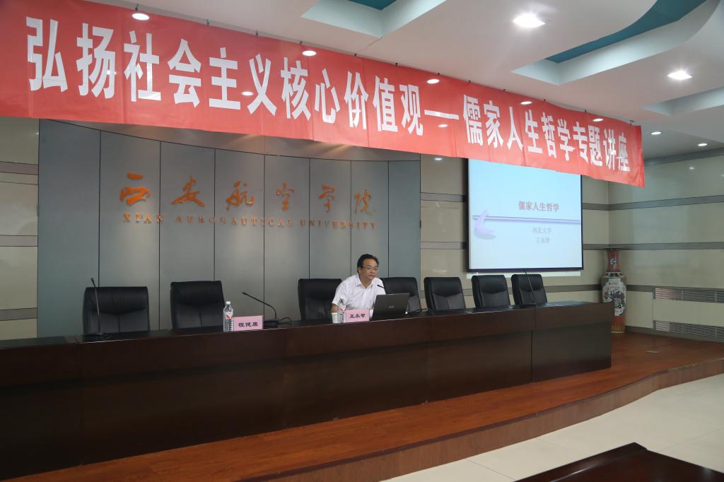 6月14日下午,由校团委、思政部共同组织举办的“弘扬社会主义核心价值观——儒家人生哲学”专题讲座在学校沣惠校区图书馆学术报告厅举行,西北大学马克思主义学院副院长王永智教授为青年学生做报告,报告会由思政部主任程健康主持。