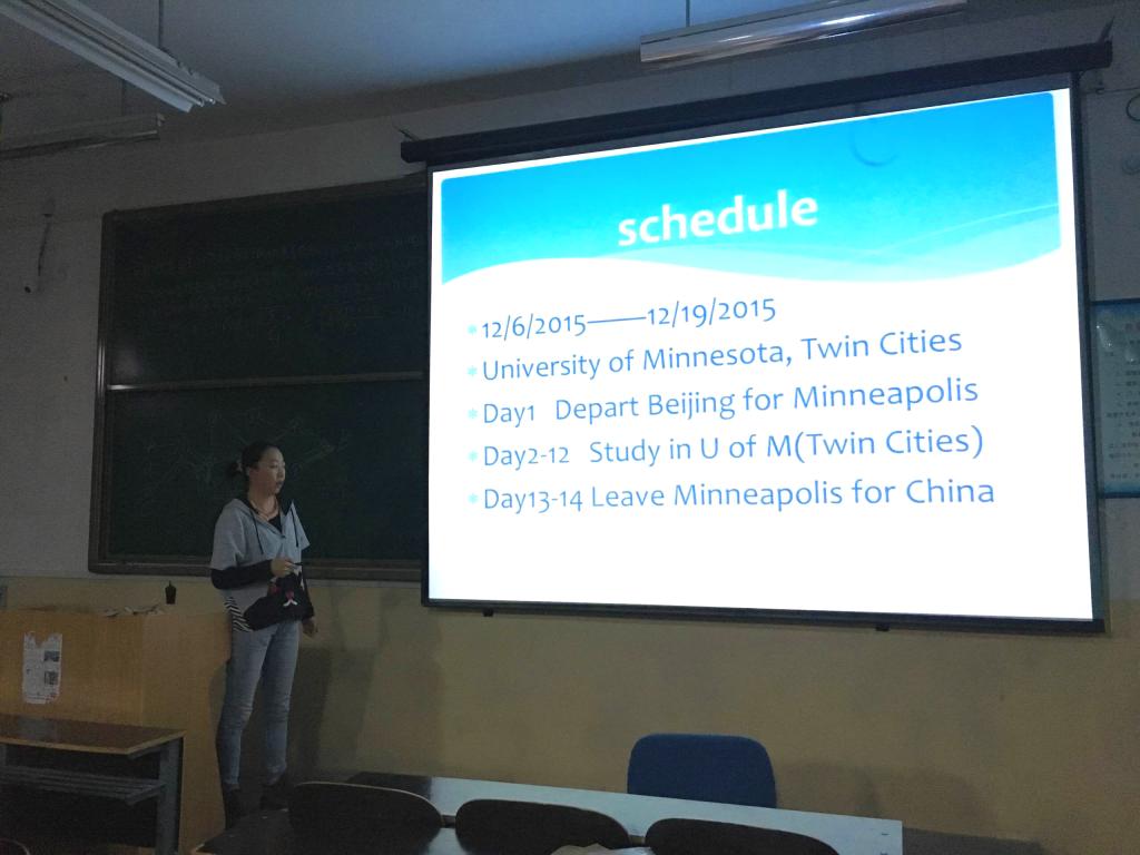 随后,访问团成员储海燕老师具体介绍了明尼苏达大学中国中心为本次培训安排的十五场专题讲座,内容涵盖美国高等教育体系介绍,通识教育的概念、背景及其与职业教育的结合,以学生为中心的课堂形式,课堂设置之情景因素与学习目标,有效学习小组,评分规则和以翻转课堂、慕课为代表的现代教育技术。