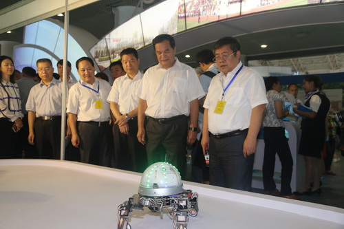 陕西省委高教工委书记李仲为、陕西省教育厅厅长李兴旺与贝博官网党委书记邓志辉、校长陈万强现场观看贝博官网机器人表演
