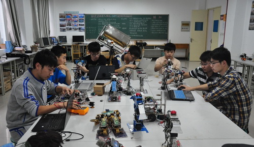 下午4时,缔造者机器人校队的同学们,开始陆续进入实验室工作,因为十月中旬要去安徽合肥参加“2014年中国机器人大赛全国总决赛”,队员们需要对做好的机器人进行不断修理、调试以达到最好的参赛状态。