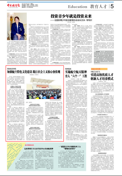 5月24日,中国航空报在第5版,以《BB贝博艾弗森官方网站加强航空特色文化 建设践行社会主义核心价值观》为题,报道了贝博官网以航空文化为主,兼容多元文化的校园文化建设规划,以航空为涵,通过多种形式、利用多种载体,开展一系列活动,诠释航空智慧,切实把社会主义核心价值观转化为广大师生的自觉追求。