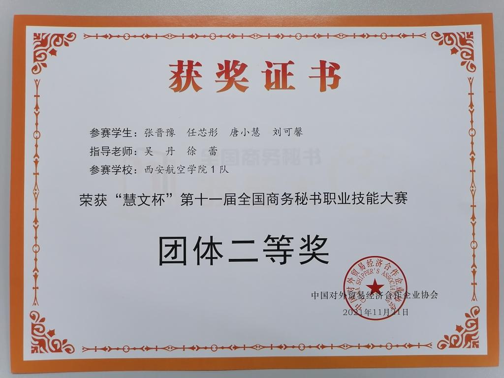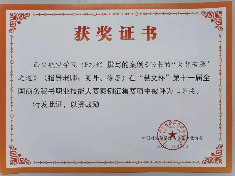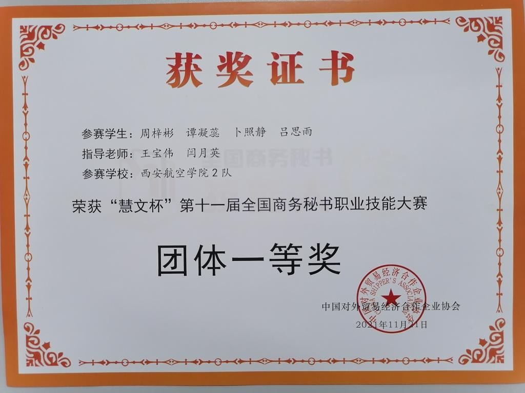 近日,由中国对外贸易经济合作企业协会主办,全国商务秘书与行政助理专家委员会、湖州职业技术学院承办的“慧文杯”第十一届全国商务秘书职业技能大赛圆满落幕。本届大赛采用线上形式进行,大赛共有来自全国19个省87所院校的159支队伍参赛。贝博官网由人文学院王宝伟、徐蕾、吴丹、闫月英老师指导的秘书学专业学生组成两支队伍参加了比赛,经过激烈角逐,最终荣获团体一等奖和团体二等奖各一项,任芯彤同学荣获案例征集个人三等奖。