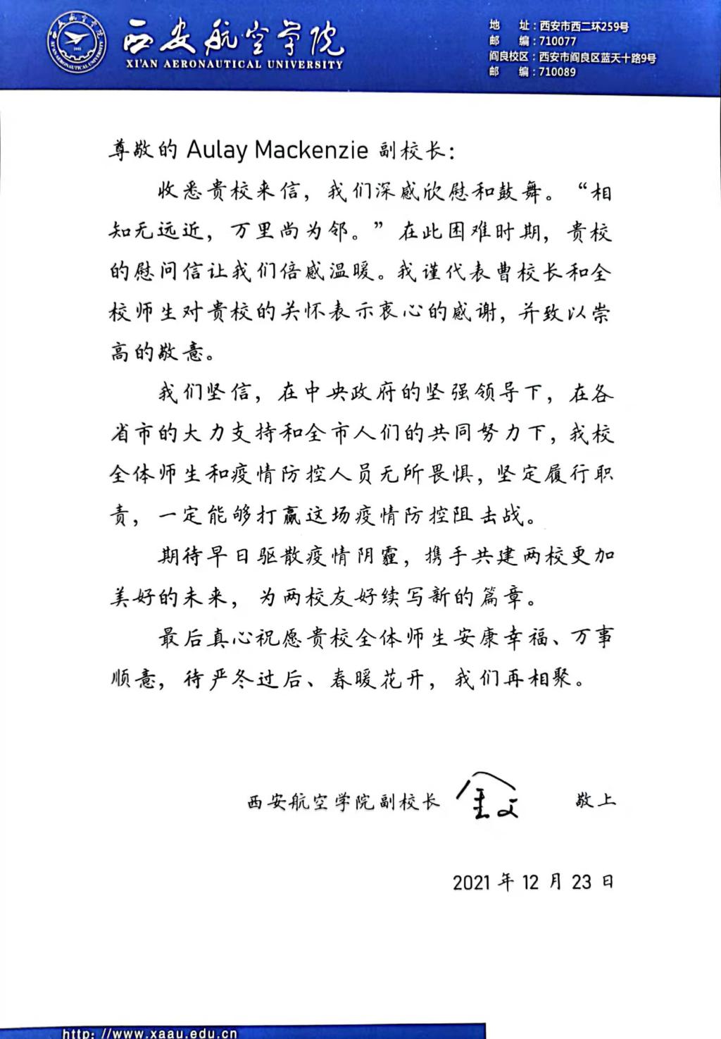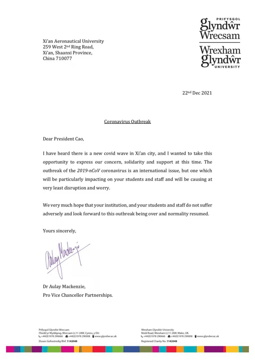 急难有情,情有馀兮。在西安再次遭遇新冠肺炎疫情袭击之时,贝博官网合作院校英国格林多大学第一时间发来慰问信。格林多大学副校长Aulay Mackenzie致信曹庆年校长,对贝博官网师生表达了最温暖的关怀与最诚挚的祝福,并期待贝博官网在防疫抗疫工作中,克难攻坚,早日取得胜利。