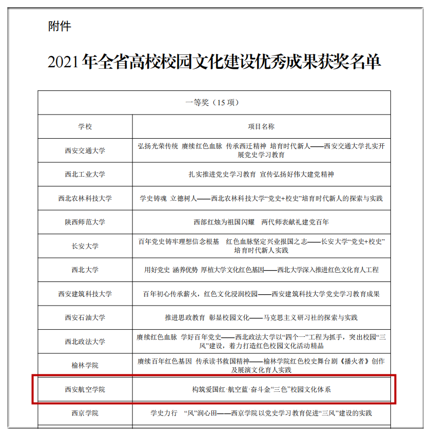 近日,省委教育工委印发《关于表彰2021年全省高校校园文化建设优秀成果的通报》(陕教工函〔2022〕40 号),共评选出一等奖15项、二等奖20项、三等奖25项,贝博官网申报的《构筑爱国红·航空蓝·奋斗金“三色”校园文化体系》荣获一等奖。这是贝博官网继2018年、2019年连续荣获一等奖以来,再次获此殊荣。