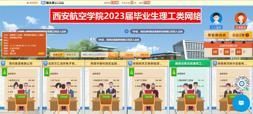 为深入学习贯彻党的二十大精神,落实教育部、省教育厅关于做好2023届毕业生就业创业工作有关部署,11月11日、18日学校与莲湖区人社局、西安航空基地人才服务中心联合举办了2023届毕业生理工类和文史经管类网络双选会。经过精心筛选,理工类网络双选会参会企业93家,其中国企16家、民企57家、外企4家、上市公司10家、中小微企业6家,提供就业岗位7193个。文史经管类网络双选会参会企业39家,其中国企3家,民企30家,外企2家,上市公司2家、中小微企业2家,提供就业岗位3096个。各学院深入动员和指导毕业生精心准备,积极参加招聘求职。两场双选会参会求职毕业生共1100余人,达成就业意向数共1300余人次。