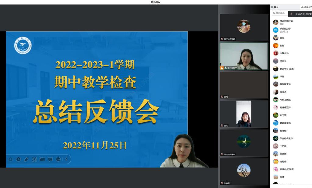 11月25日上午,学校召开2022-2023学年第一学期期中教学检查总结反馈会,会议采取线上方式召开。副校长金文、教学质量监控与评价处(以下简称质评处)、教务处、学生工作部(处)、教师工作部、后勤保障处、网络信息中心、校办工厂及各二级学院(部)负责人参加了会议。会议由质评处处长刘宁主持。
