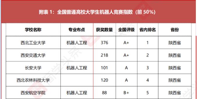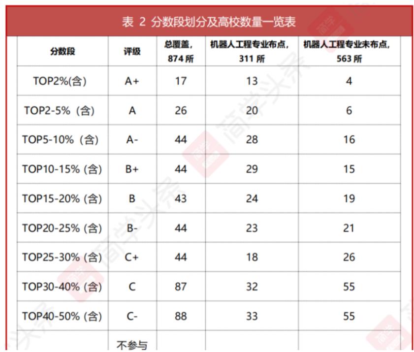 本轮发布的全国普通高校机器人竞赛指数(本科,2022版)对分数位于前50%的学校进行评级,并划分为A+、A、A-、B+、B、B-、C+、C、C-等九个等级,对前50%的学校分省列出省内排序。